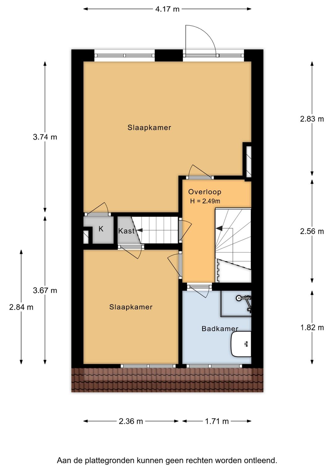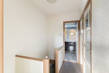 1e verdieping: overloop, twee slaapkamers met vaste kasten. De achterkamer heeft een toegangsdeur tot het dak. De badkamer is v.v. een douche en wastafel.