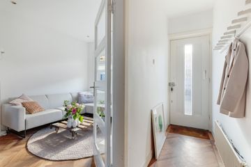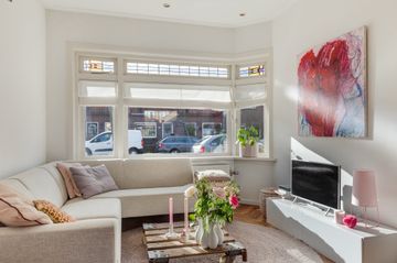 Indeling: hal, deur naar woonkamer met opvallend veel lichtinval, de erker maakt de kamer erg ruimtelijk.