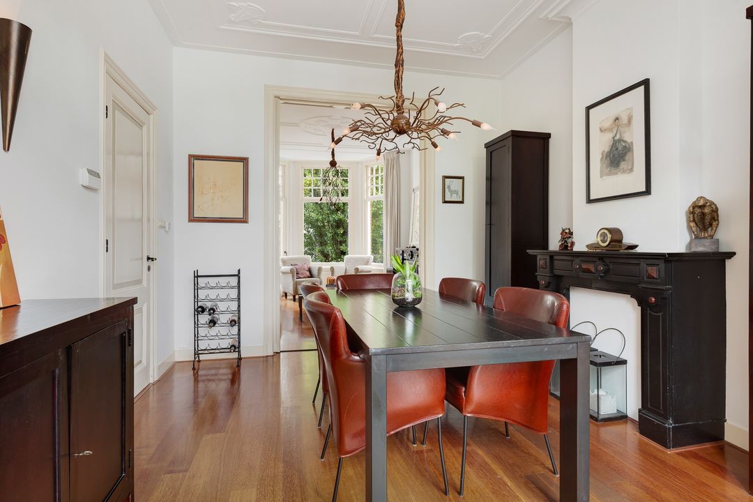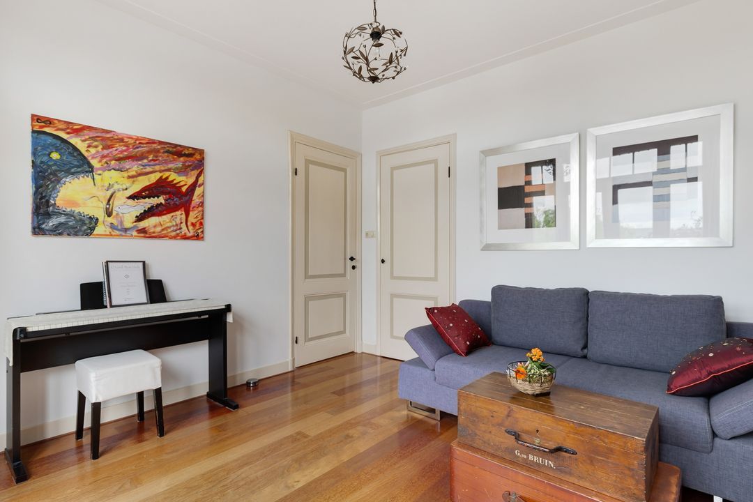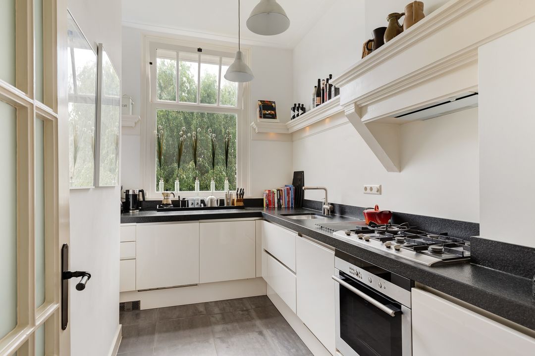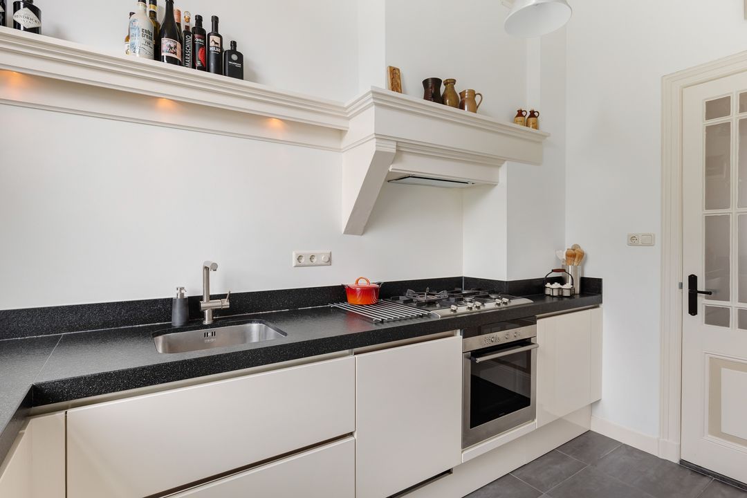 Overloop, toilet, keuken v.v. inbouwapparatuur, woonkamer en suite met authentieke details en een erker, achterkamer met inpandig balkon.