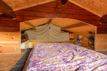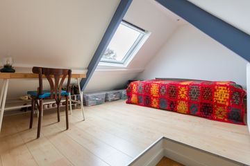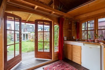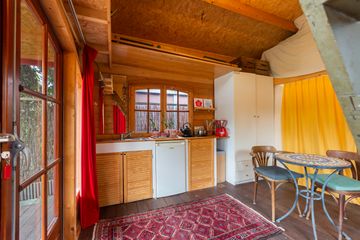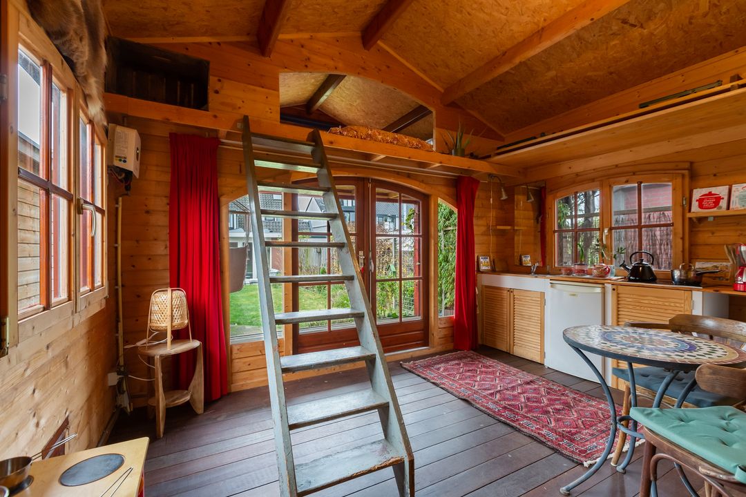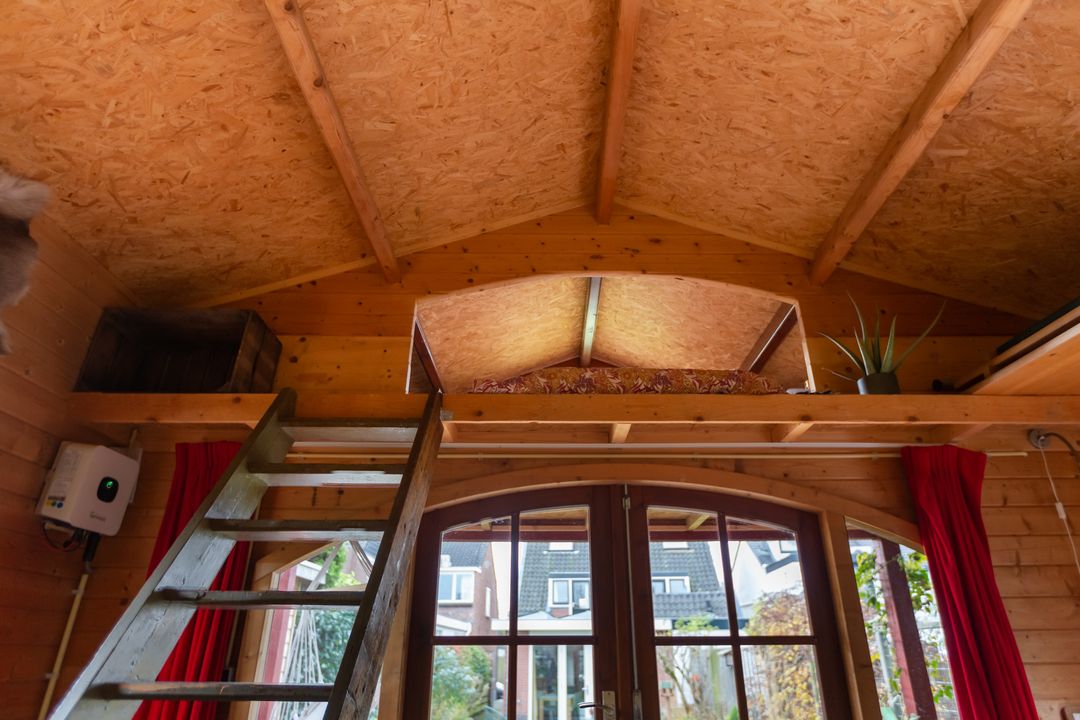 Een slaapplek op de vide en aangesloten keukentje is deze tiny house geschikt voor vele doeleinden zoals een atelier of thuiswerkplek.