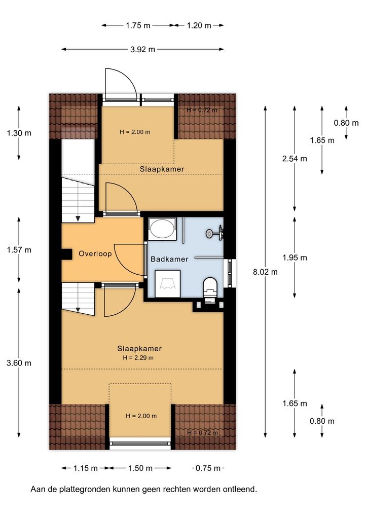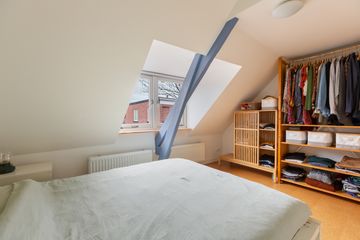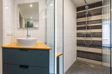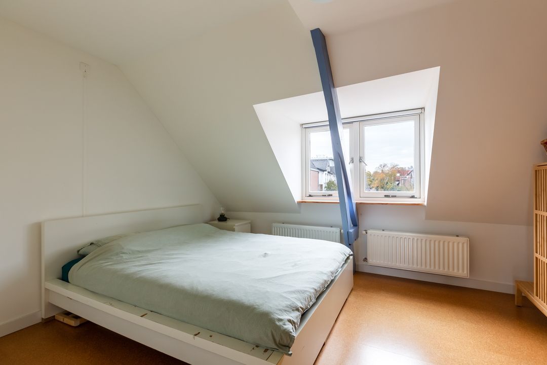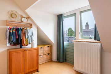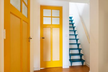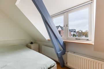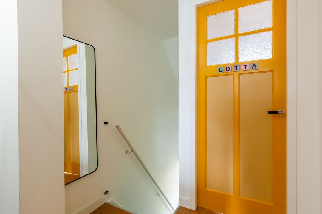 Trap naar eerste verdieping met twee slaapkamers en badkamer v.v. douche, toilet, wastafel en wasmachineaansluiting.