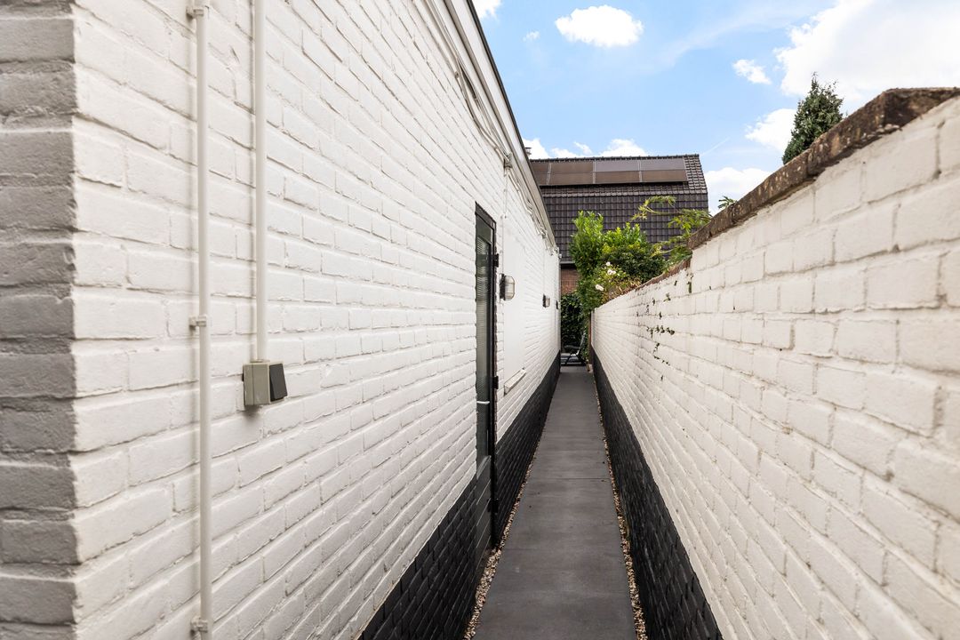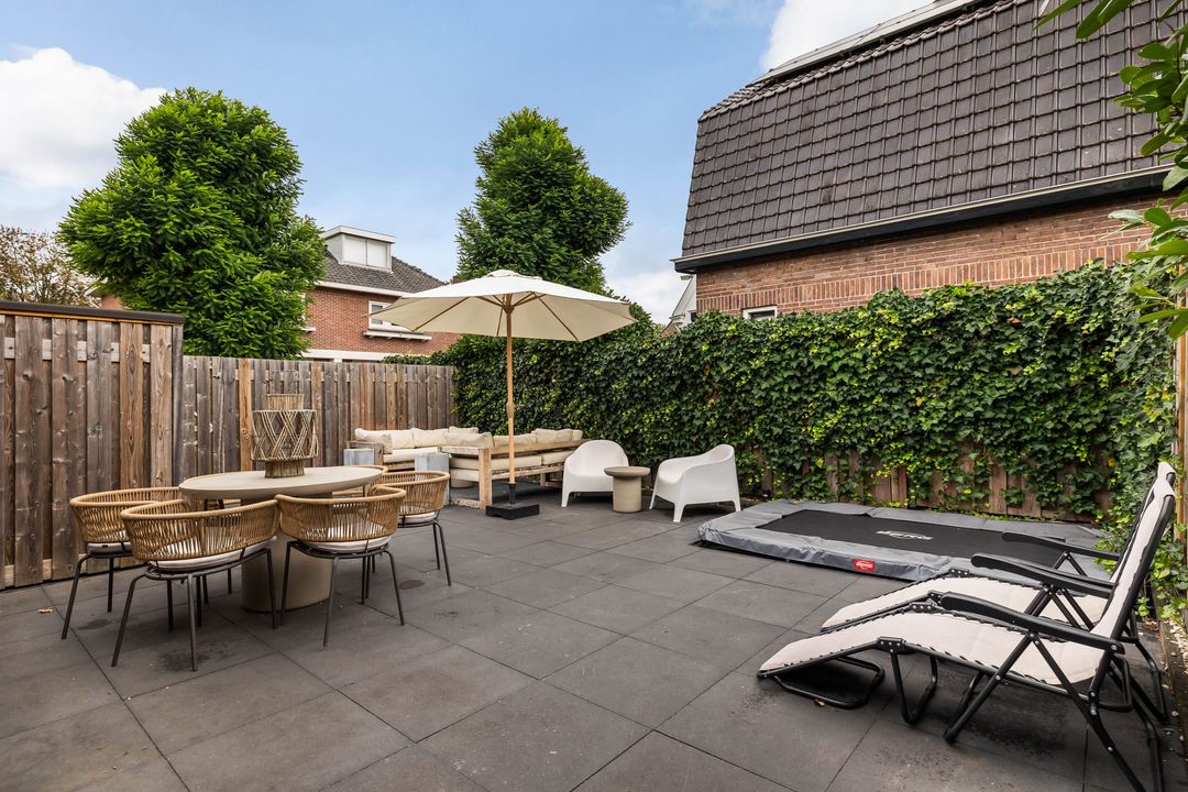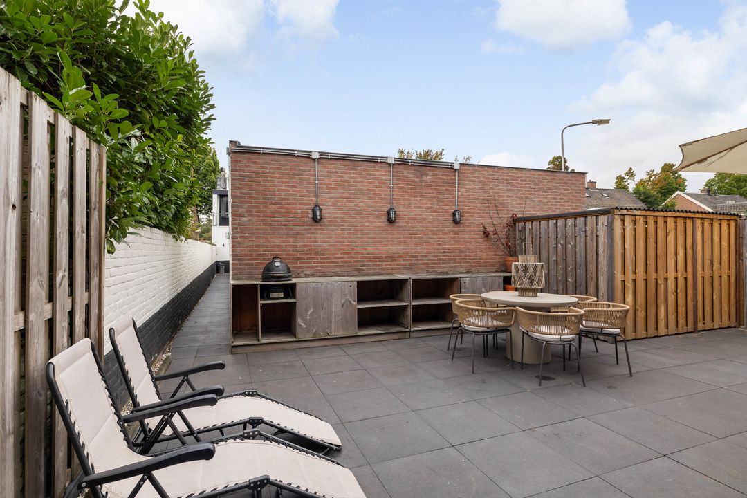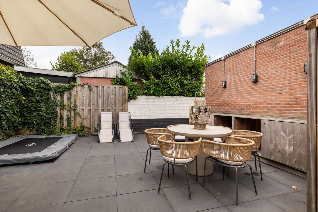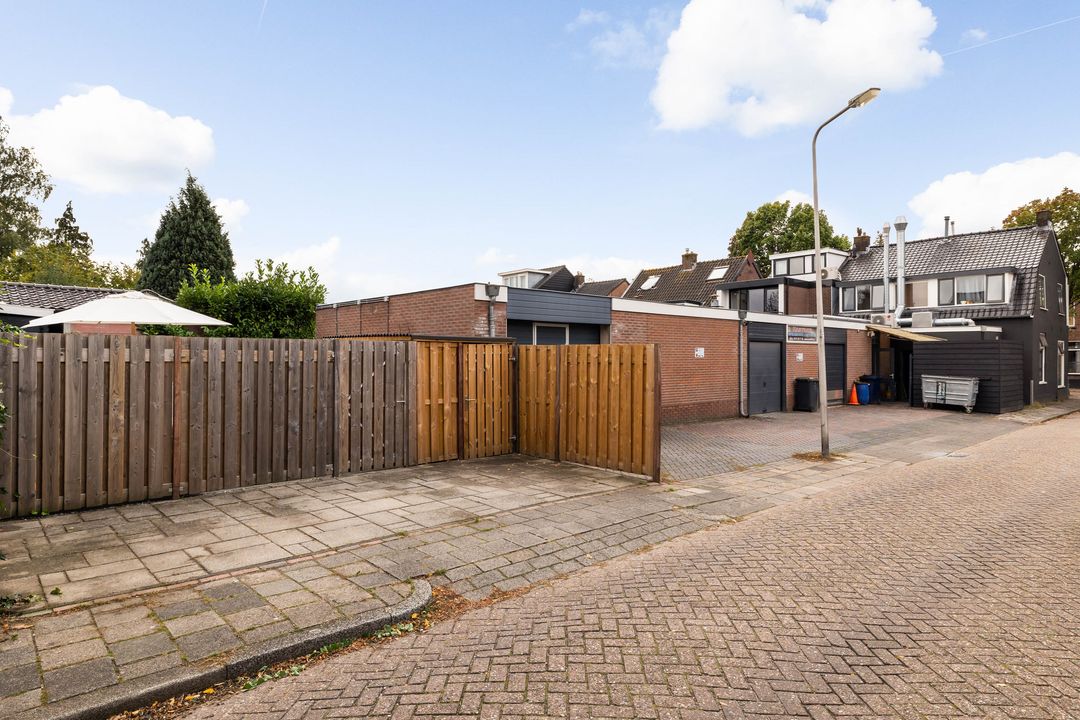 Via de keukendeur komt u op de binnenplaats met een looppad achter de bebouwing langs naar de Hortensialaan, daar bevindt zich de royale tuin met eigen parkeerplaats en grote houten schuur /berging.