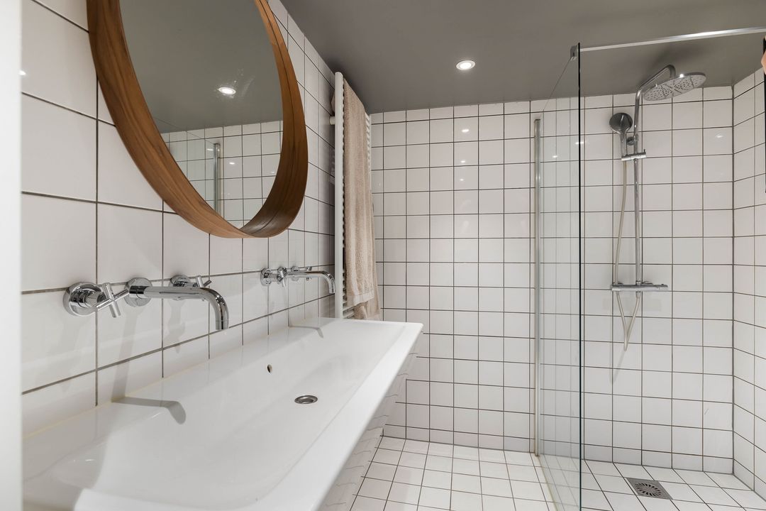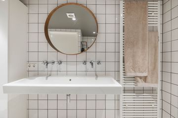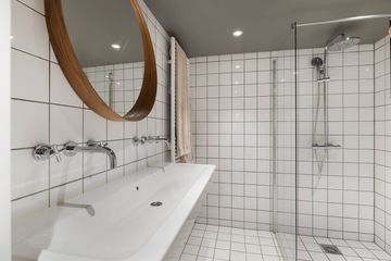 De badkamer voorzien van een douche, dubbele wastafel en toilet.