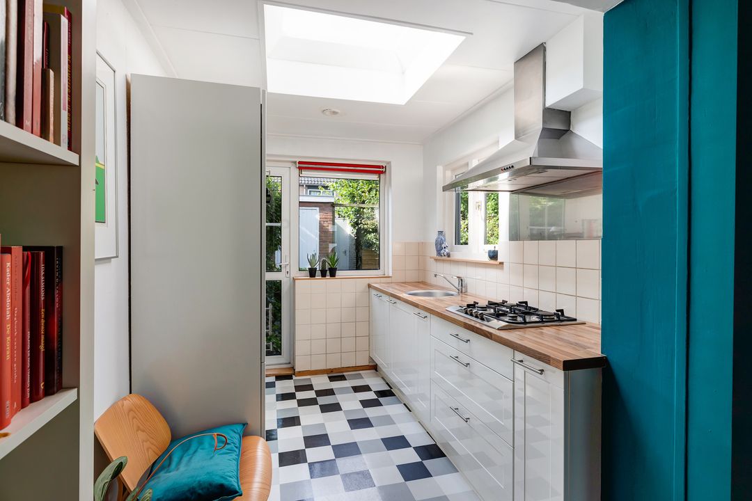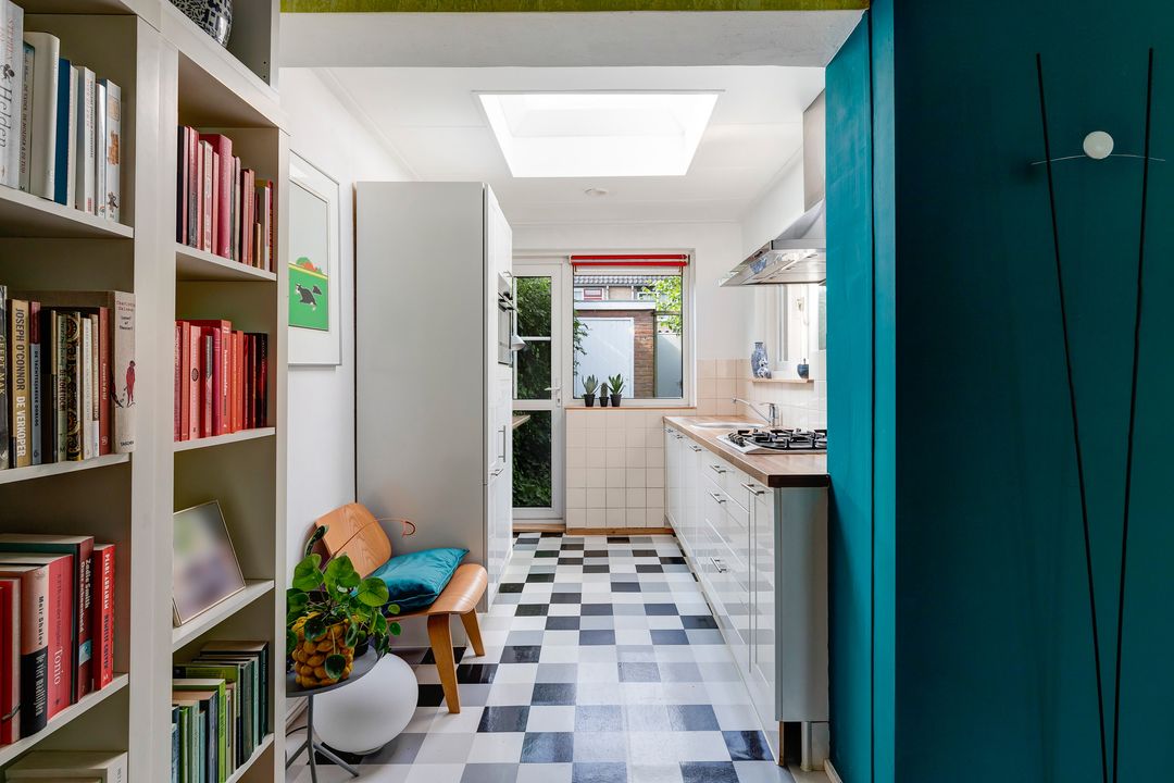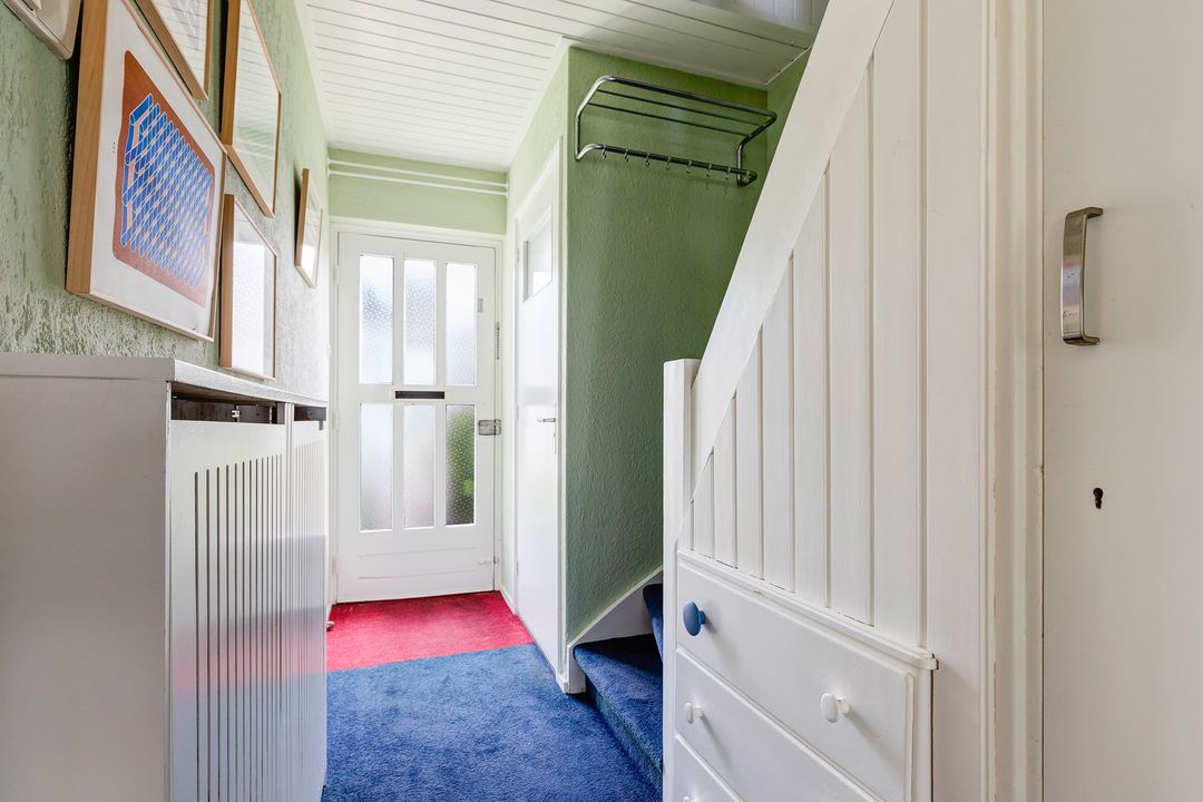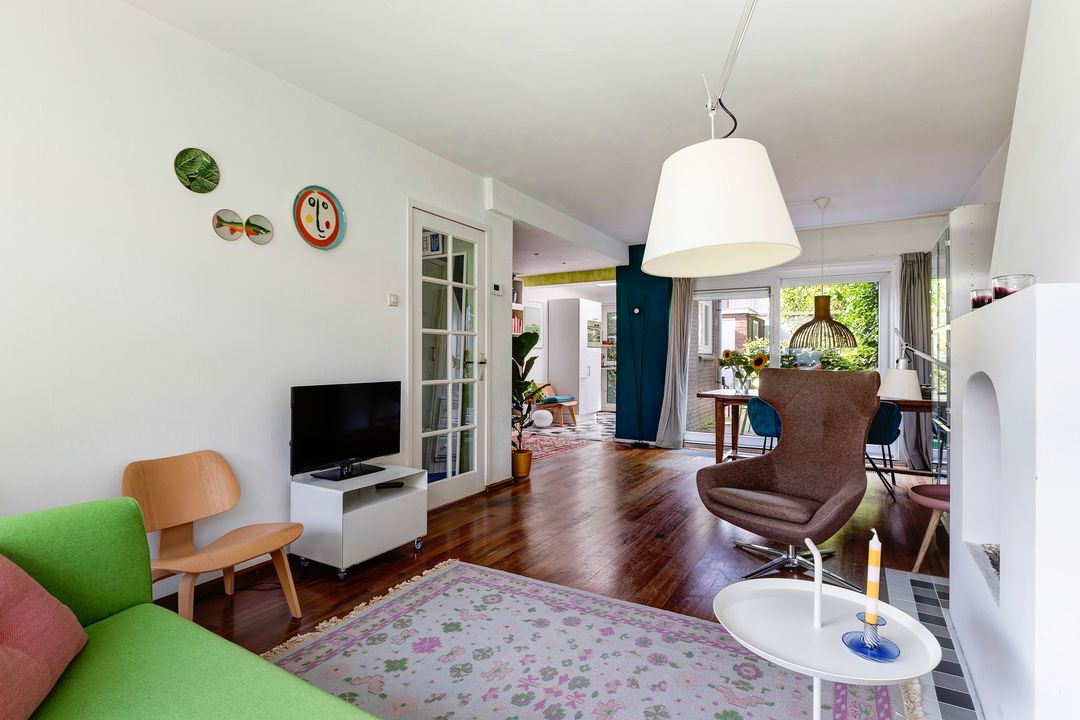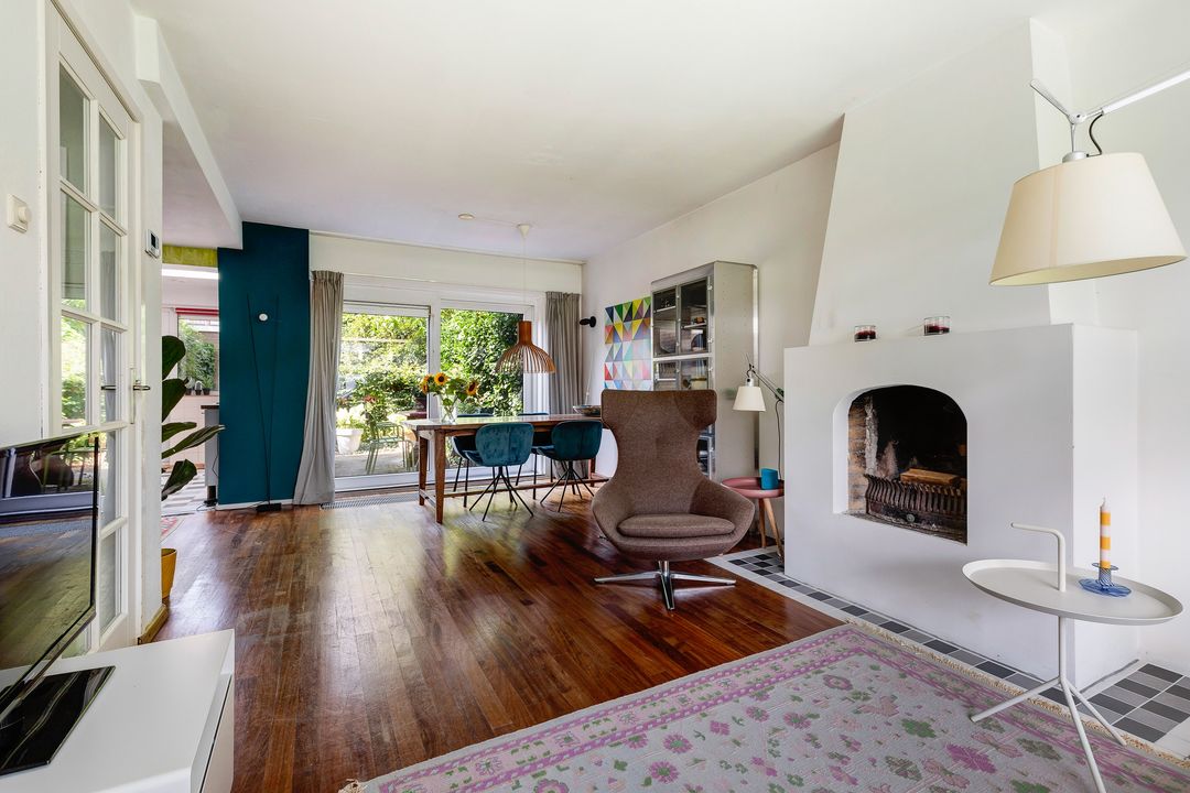 Begane grond: Hal, toilet, woonkamer, open keuken met inbouwapparatuur en deur naar de achtertuin.