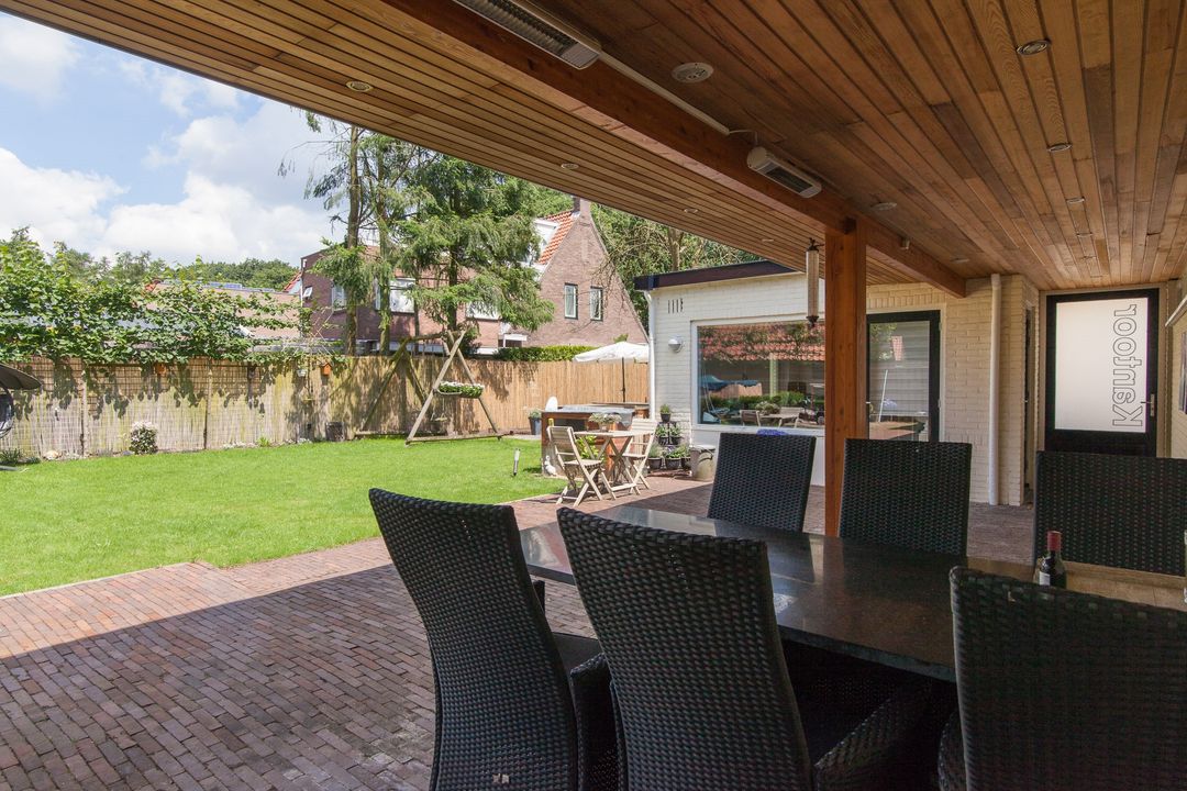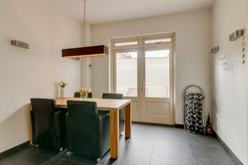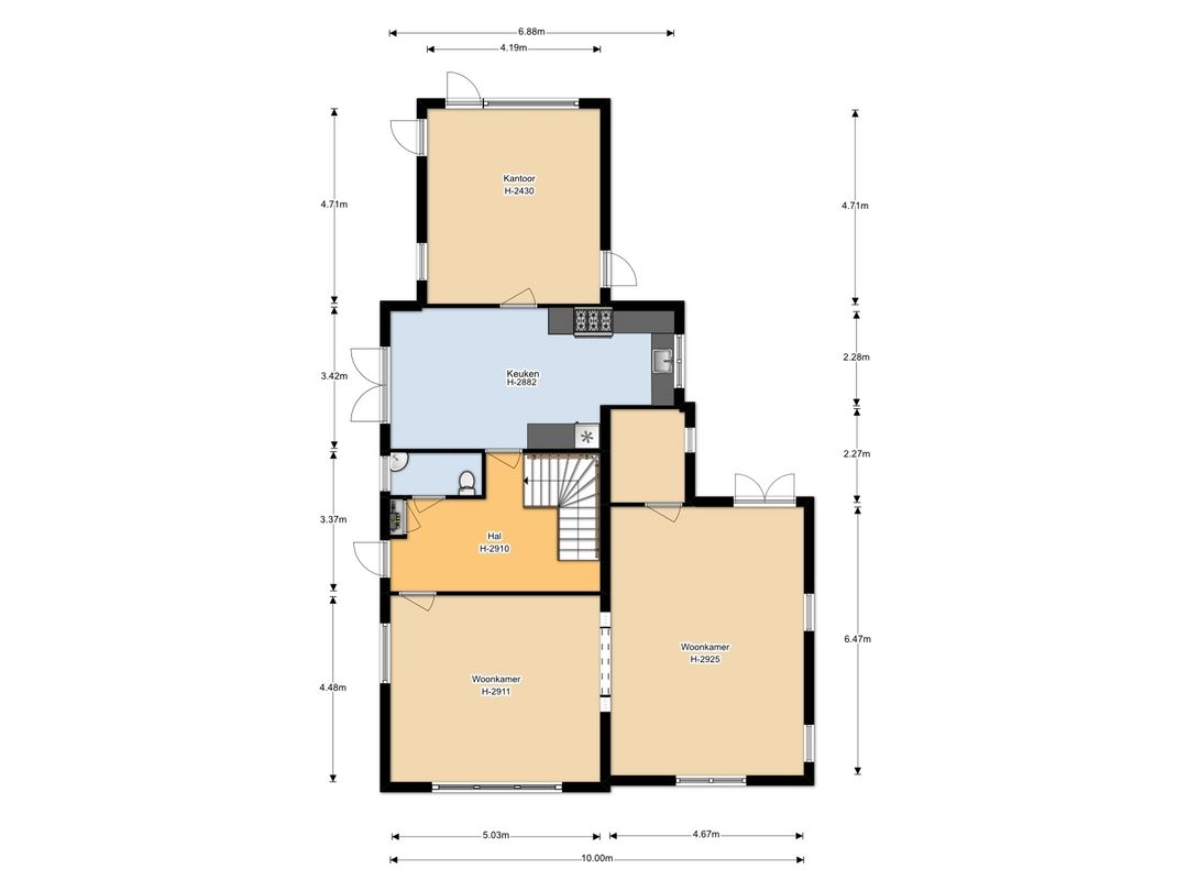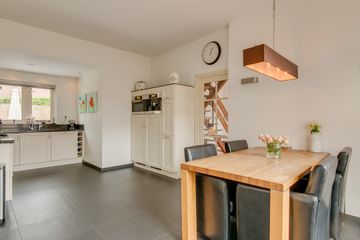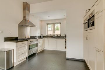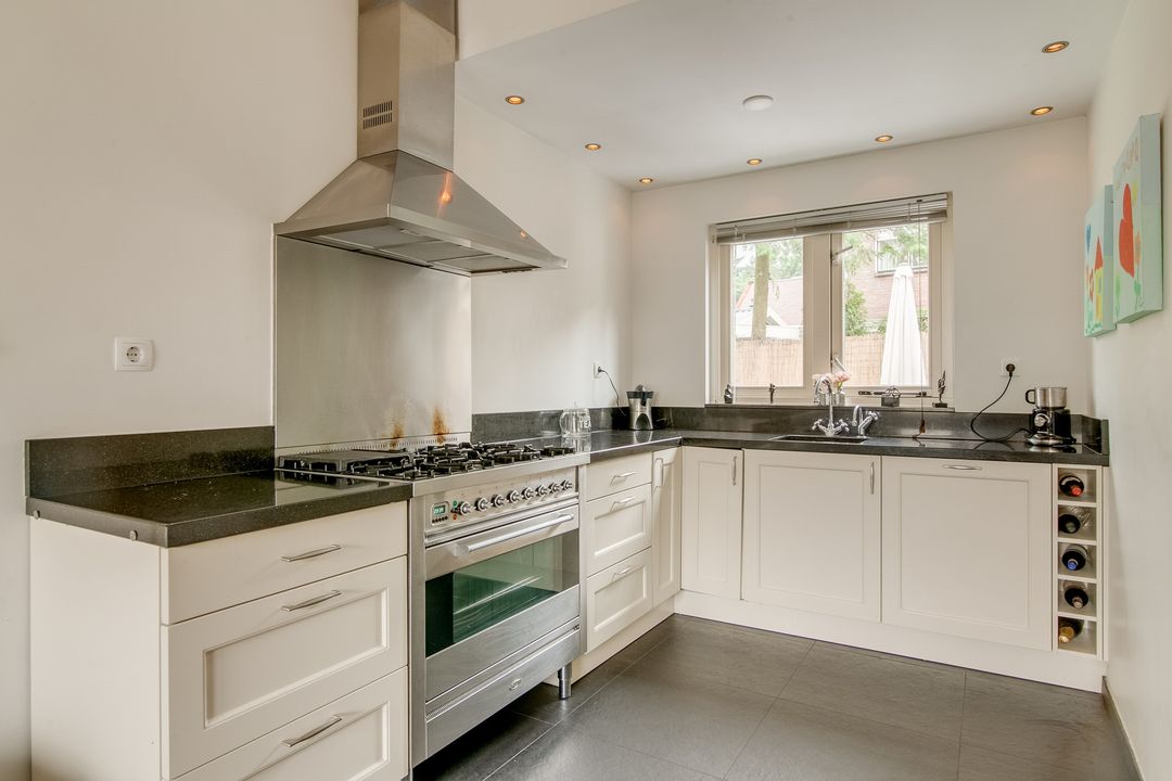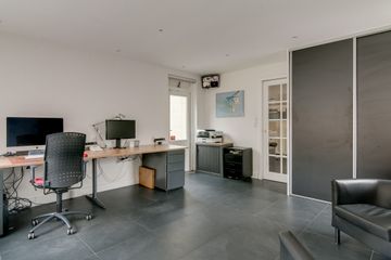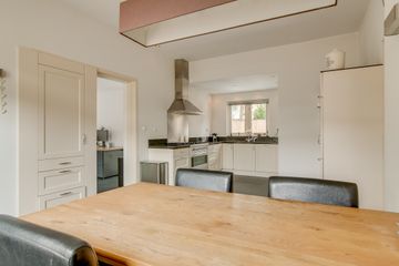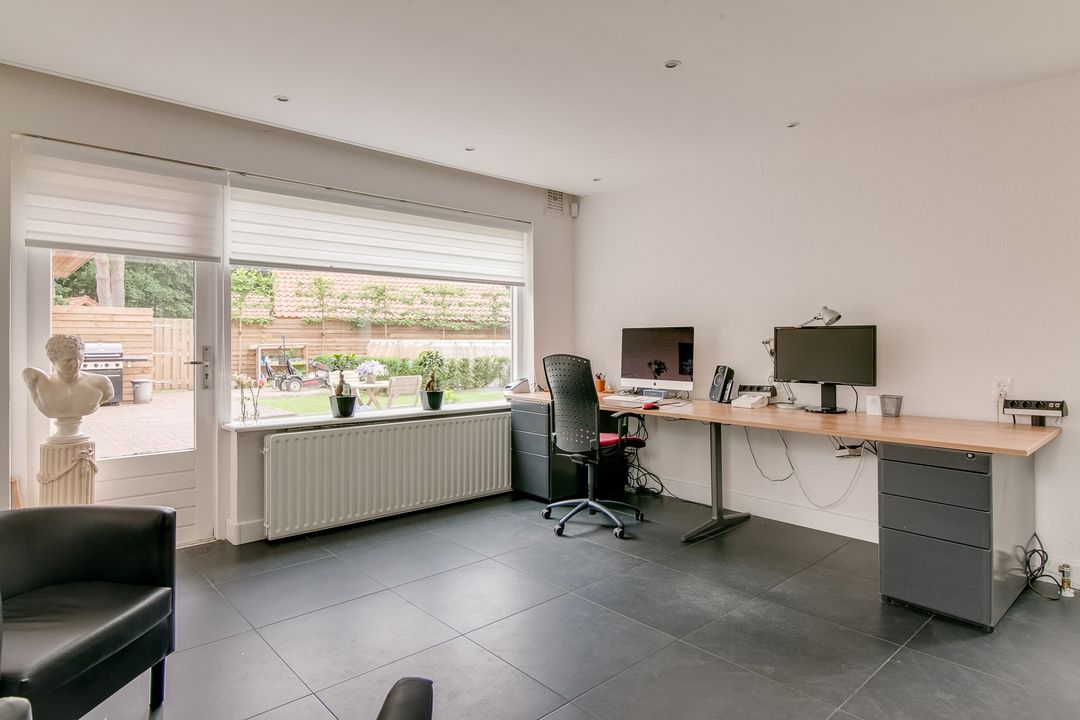 Vanuit de hal een deur naar de wooneetkeuken met alle denkbare apparatuur en zwart granieten aanrechtblad. Vanuit de keuken loopt u naar de aangebouwde kantoorkamer, afmeting circa 20 m2.