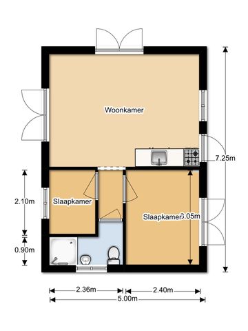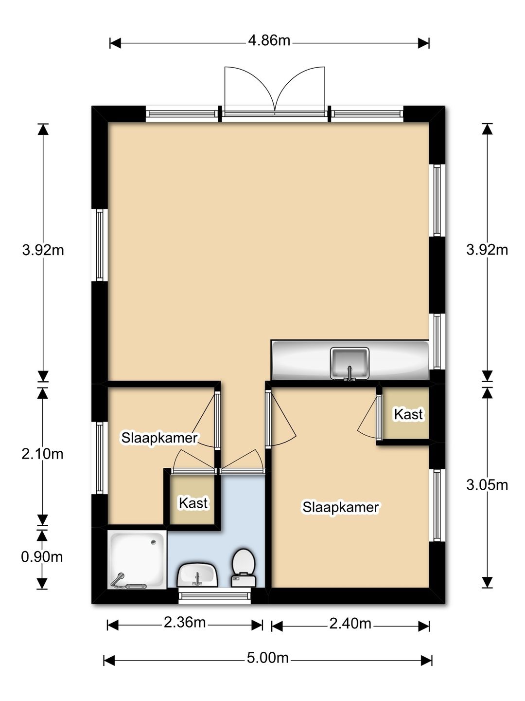 De bungalow voor 4-6 personen is 40 m2 (5 meter breed en 8 meter lang) en beschikt op de begane grond over twee slaapkamers, waarvan een met een stapelbed. Ook deze bungalow beschikt over een vide waar nog twee slaapplaatsen mogelijk zijn.