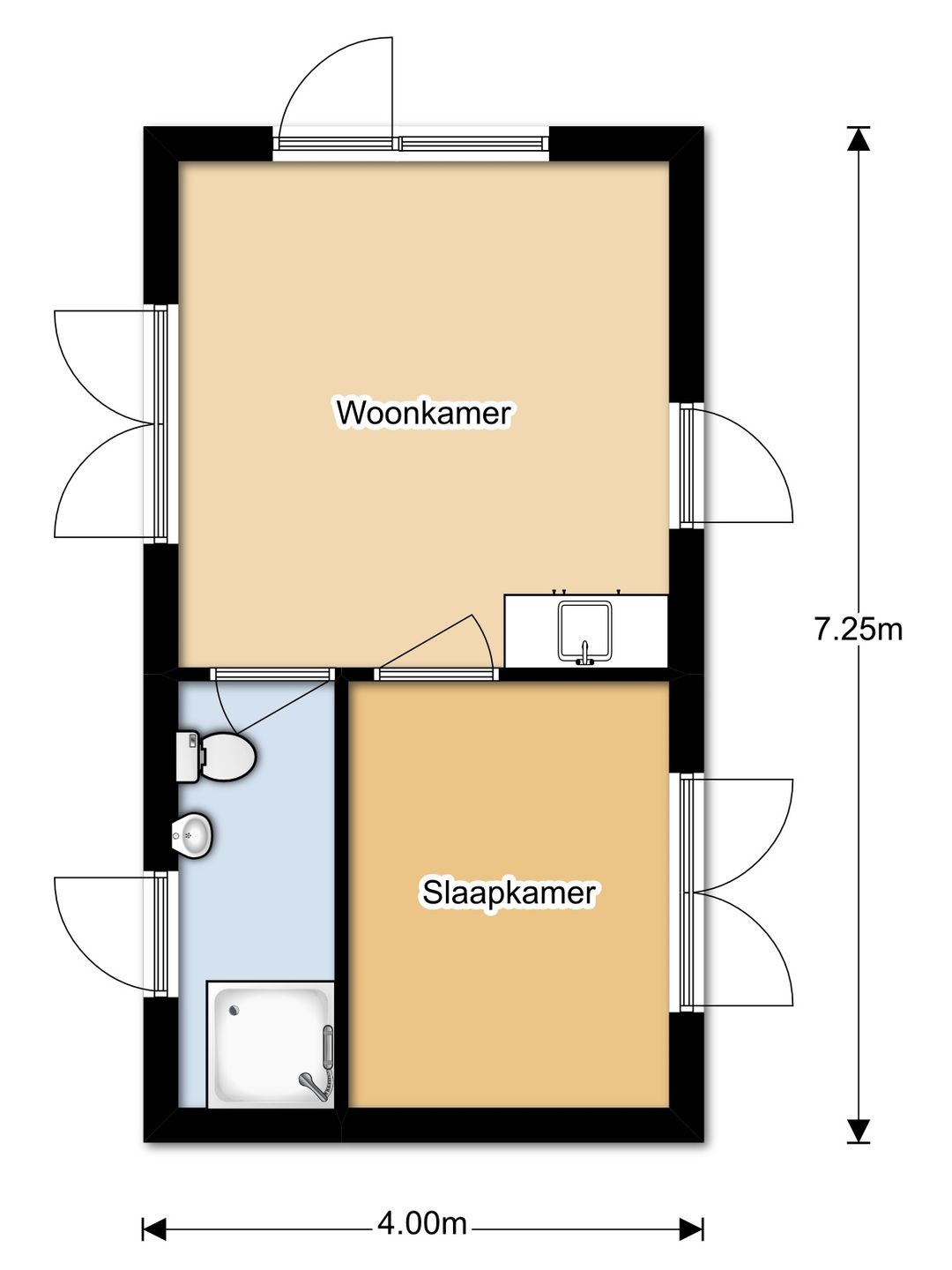 De bungalow voor 2-4 personen is 32 m2 (4 meter breed en 8 meter lang) en beschikt over een slaapkamer beneden en heeft een open vide die met een losse trap bereikbaar is. Op de vide zijn twee slaapplaatsen mogelijk. De hoogte is echter zeer beperkt.