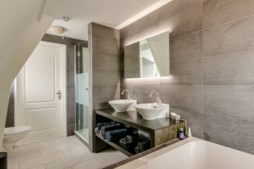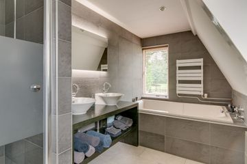 Eigen badkamer met douche, wastafel en een zeer grote bergkamer.