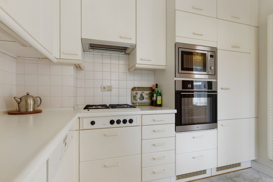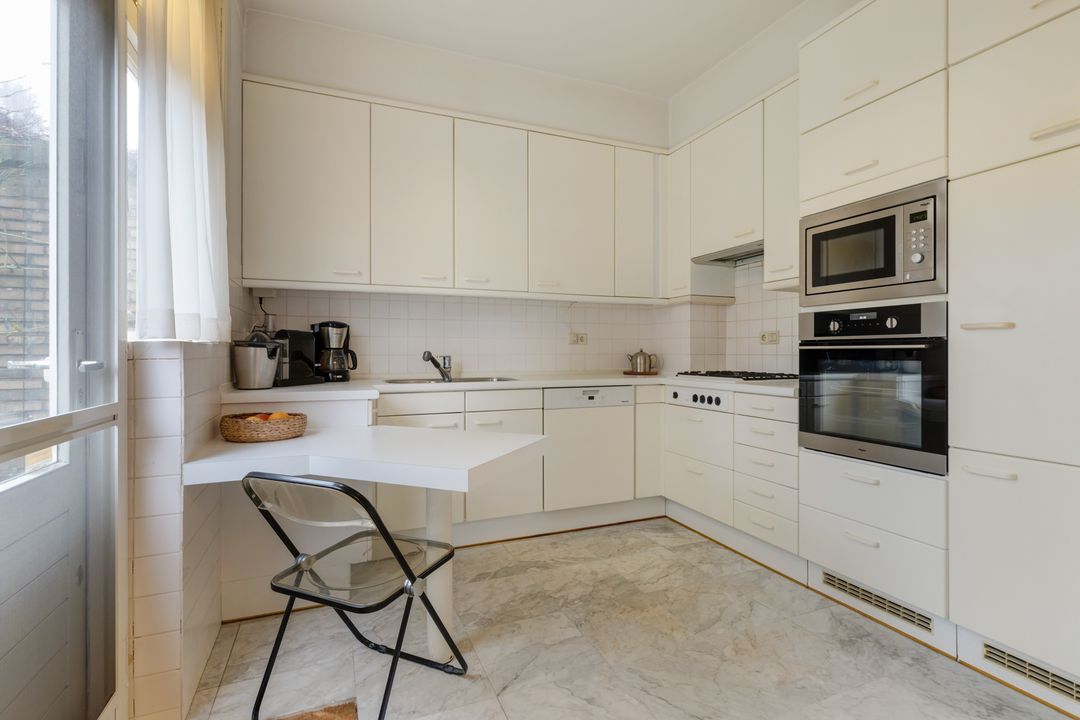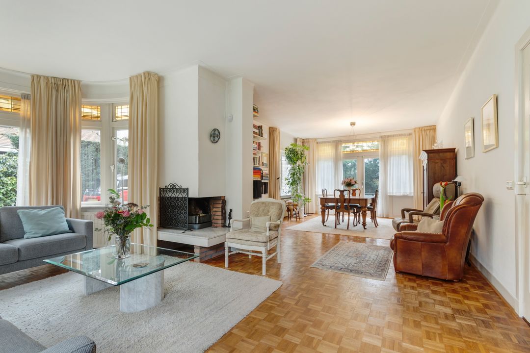 Woonkamer ( ± 40m2 ) met prachtige ronde serre met het originele glas in lood gemaakt in dubbel glas, de openhaard is centraal gesitueerd en de woonkamer is voorzien van massief parket vloer en openslaande deuren naar de tuin, keuken met tevens een deur naar de tuin