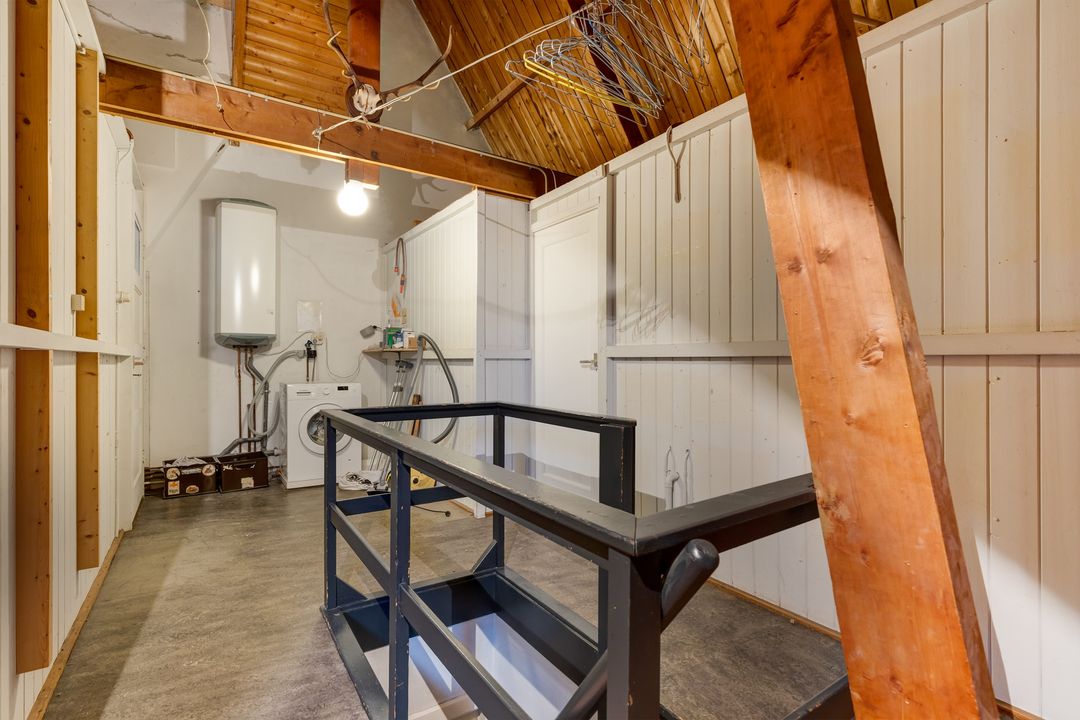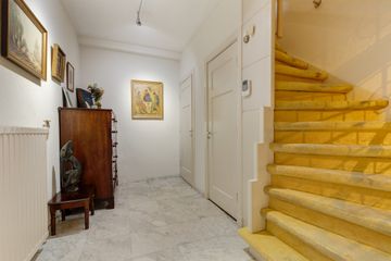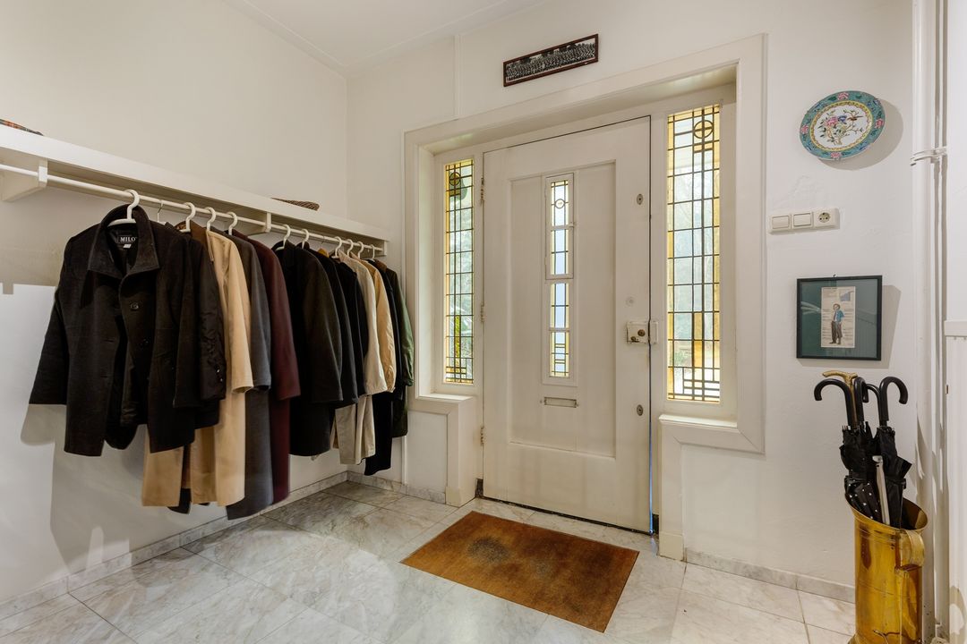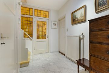 Via de vestibule met originele glas in lood draaideur komt u in de centrale hal een deur naar het souterrain met een voor/provisie kelder (totaal ongeveer 19 m2) en aparte deur naar de ruime stookkelder, ruim toilet met fontein.