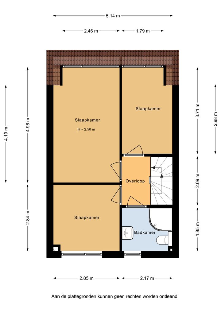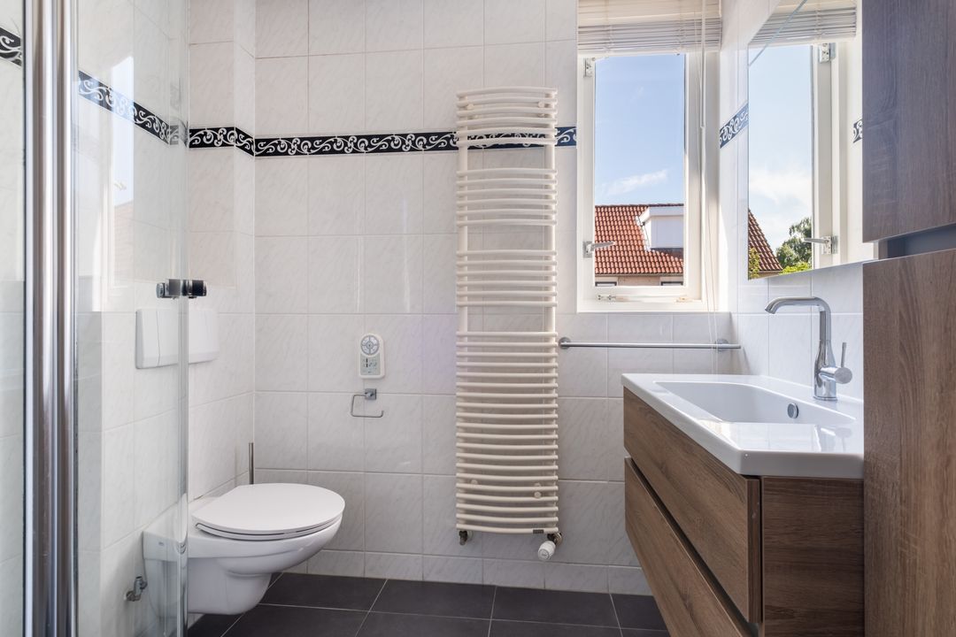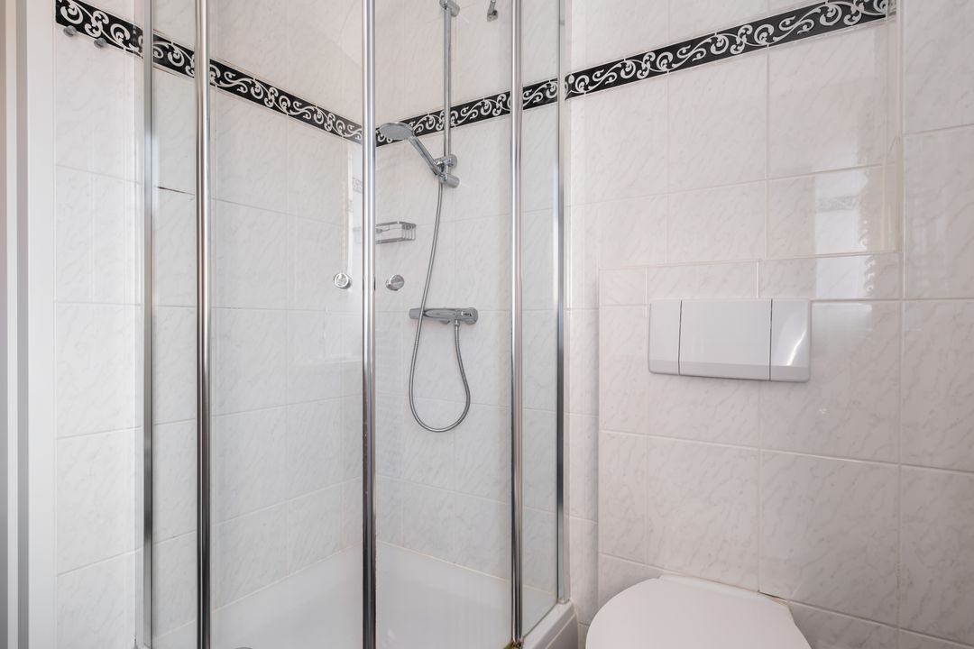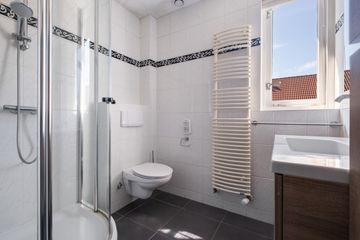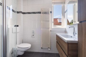 Overloop, drie slaapkamers waarvan twee extra ruim door de dakkapel over de gehele achterzijde. Nette badkamer met douche, toilet en wastafel.