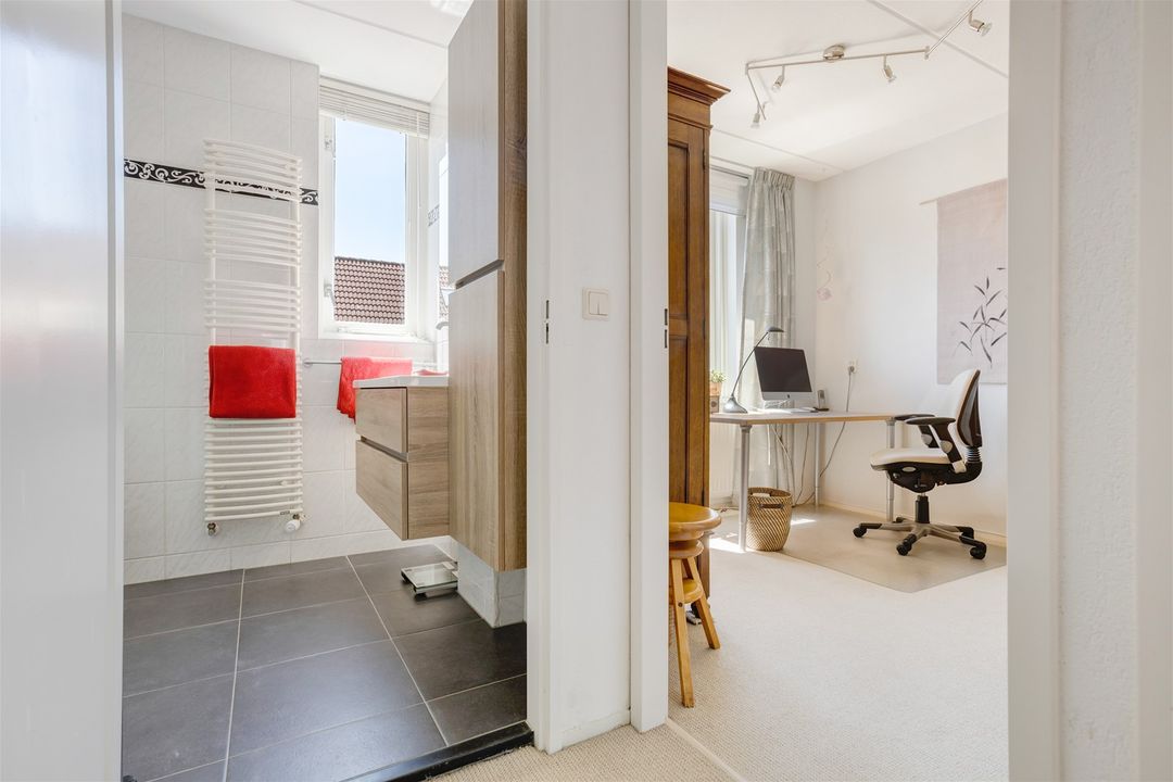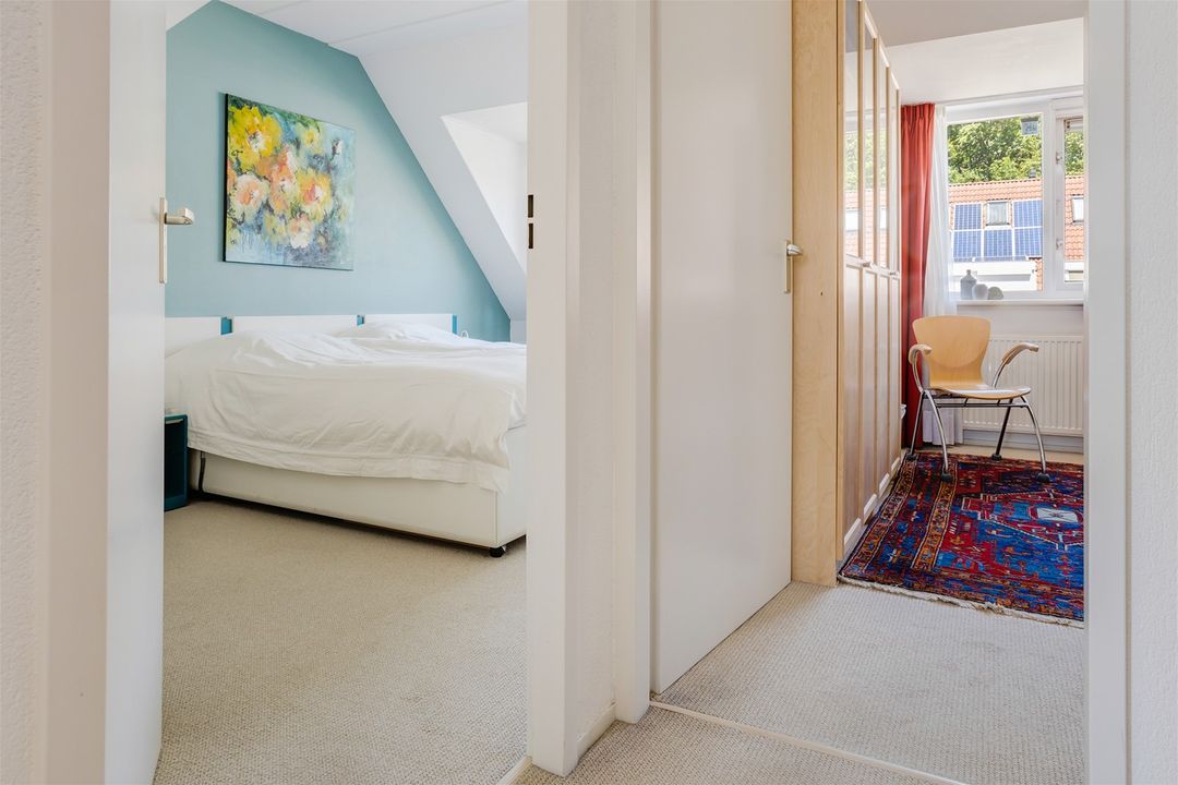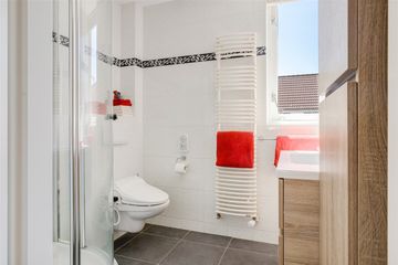 Drie slaapkamers over de gehele achterkant is een dakkapel geplaatst waardoor er 2 slaapkamers opvallend groot zijn, badkamer met toilet, douche en wastafel