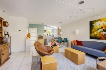 Hal, toilet, woonkamer met open keuken uit 2019 met diverse inbouwapparatuur, deur naar de achtertuin.