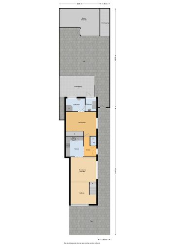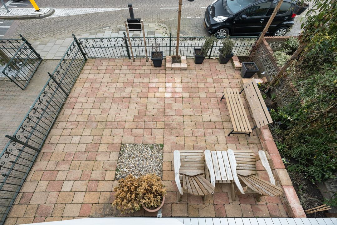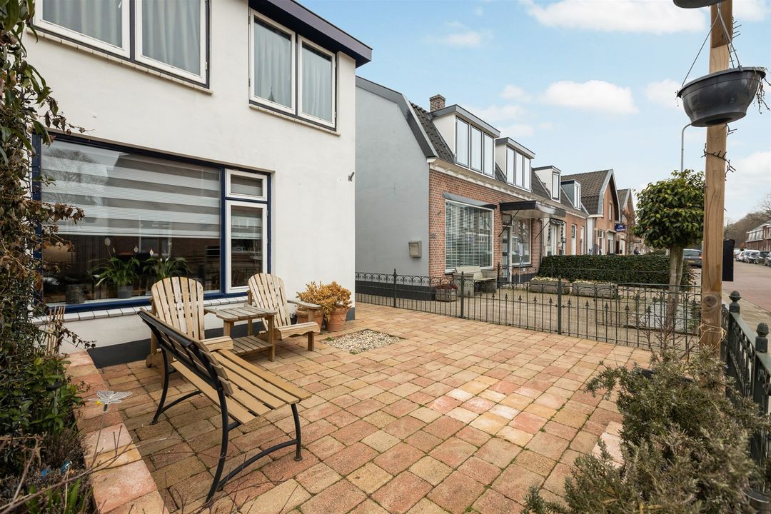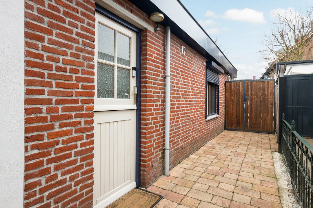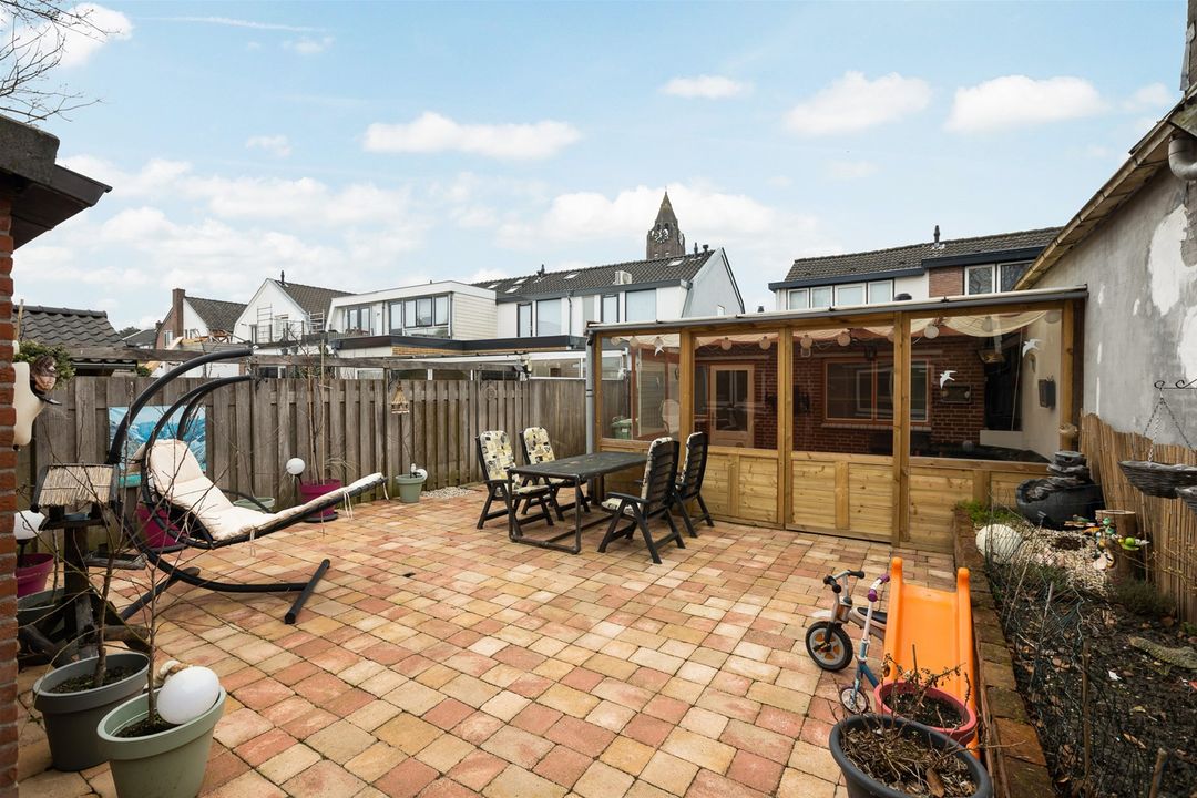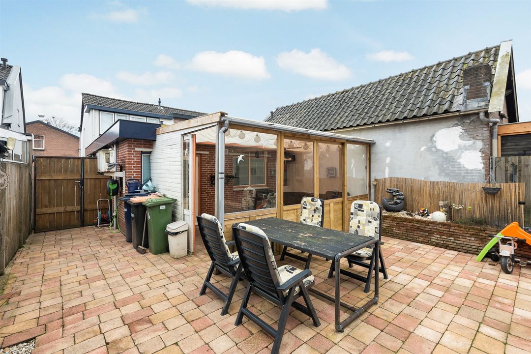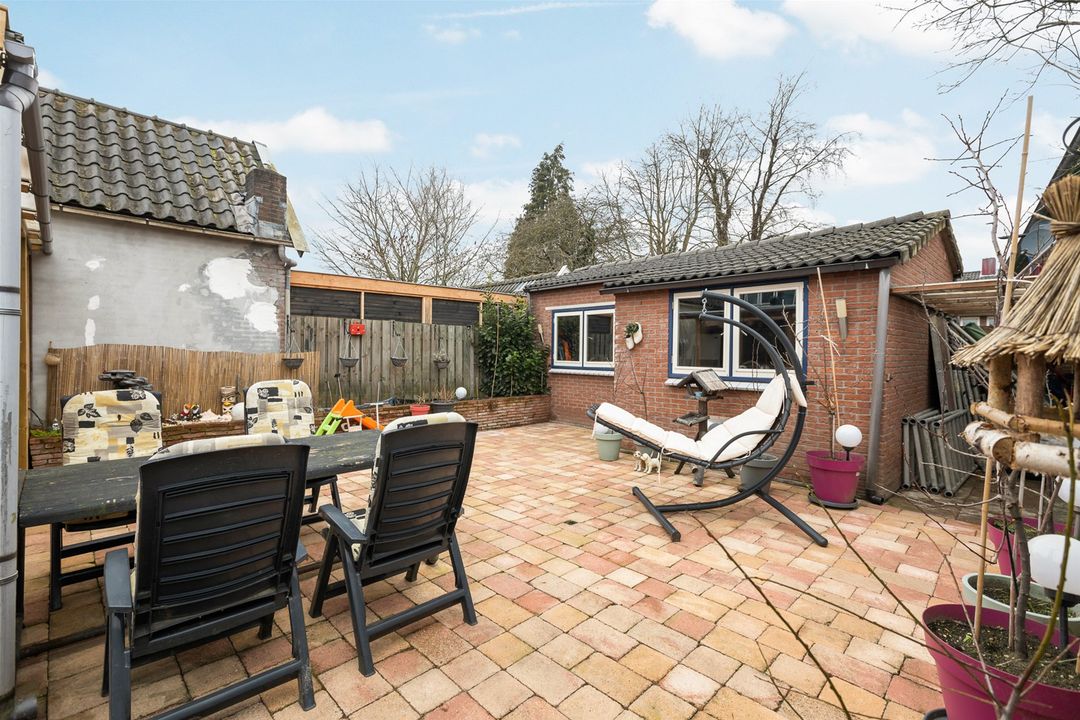 Achter en naast de woning is een ruime tuin aanwezig, grotendeels bestraat.