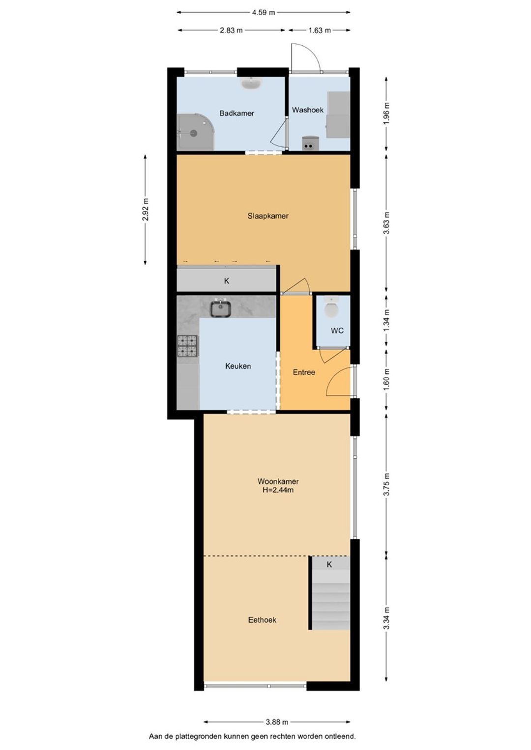 Entree, hal, keuken, woonkamer, toilet, slaapkamer, badkamer en bijkeuken. In de woonkamer is een trap en de 1-ste verdieping bereikbaar.