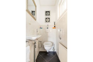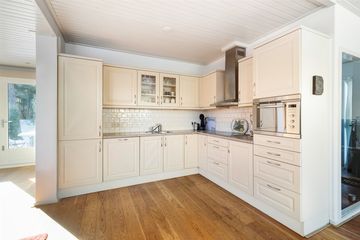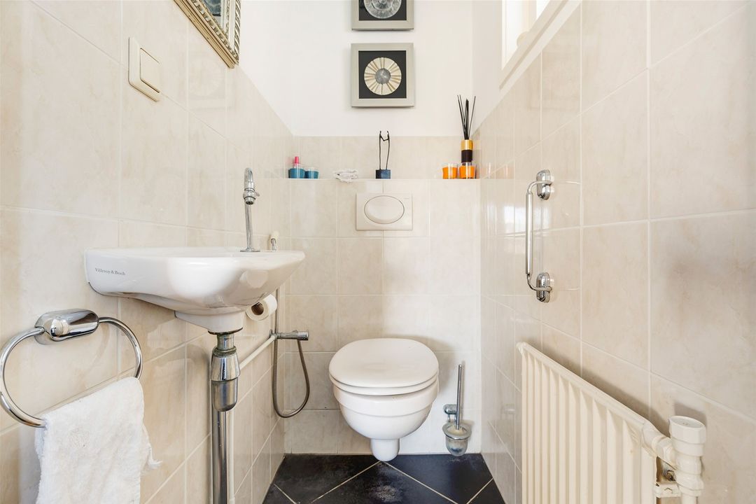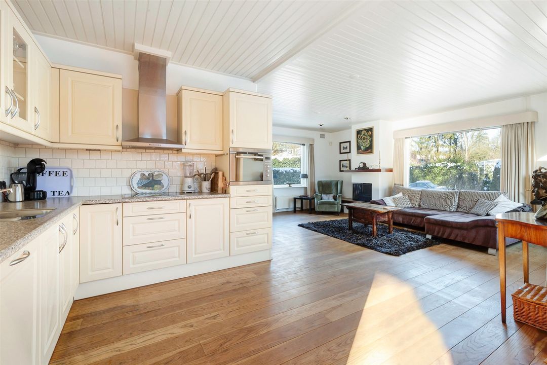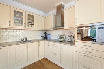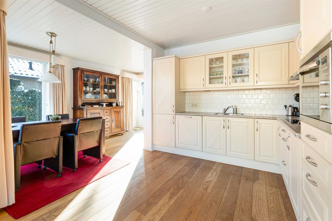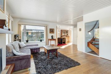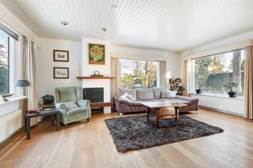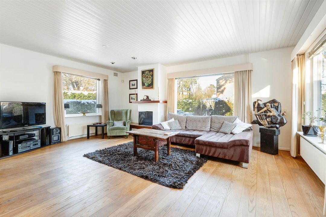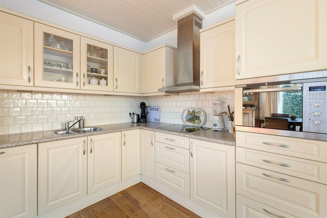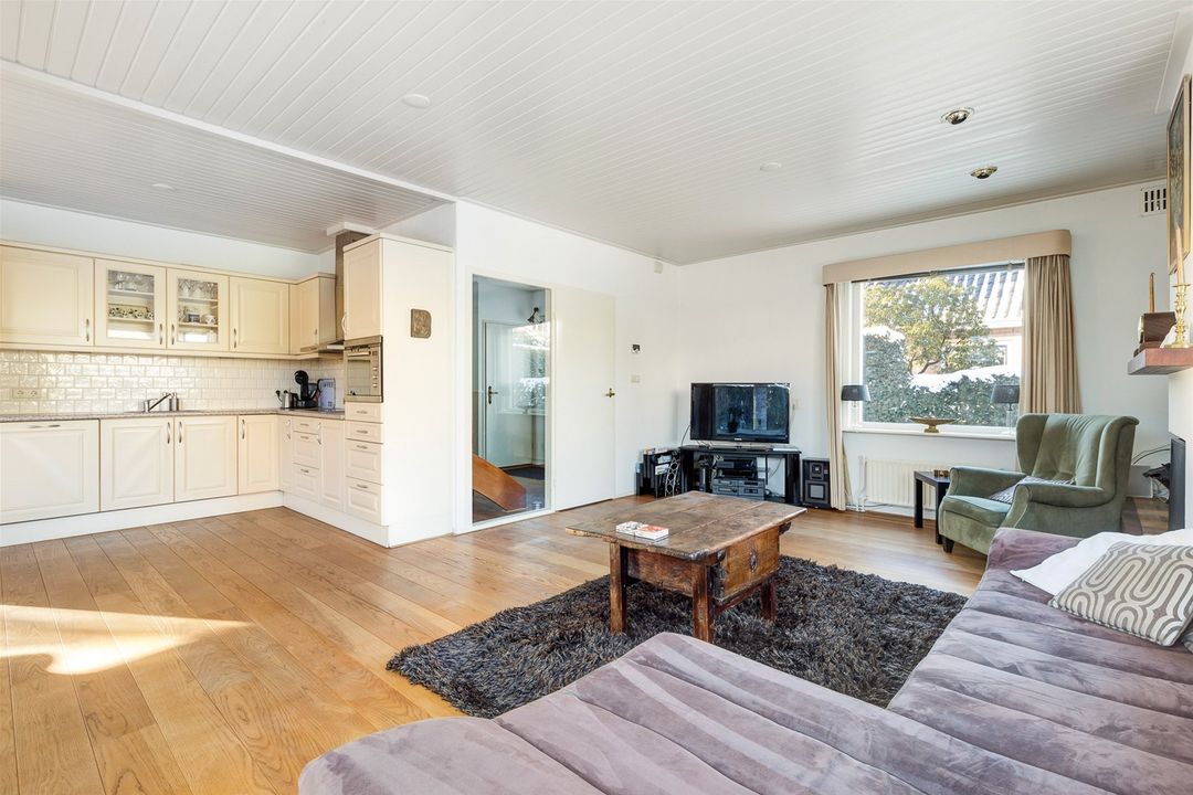 Entree/ruime hal, meterkast en toiletruimte. Gezellige lichte ruime woonkamer met openhaard en openslaande deuren naar de achtertuin. Open hoekkeuken voorzien van inbouw apparatuur.