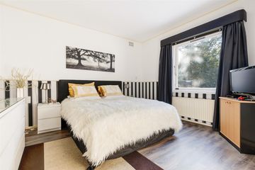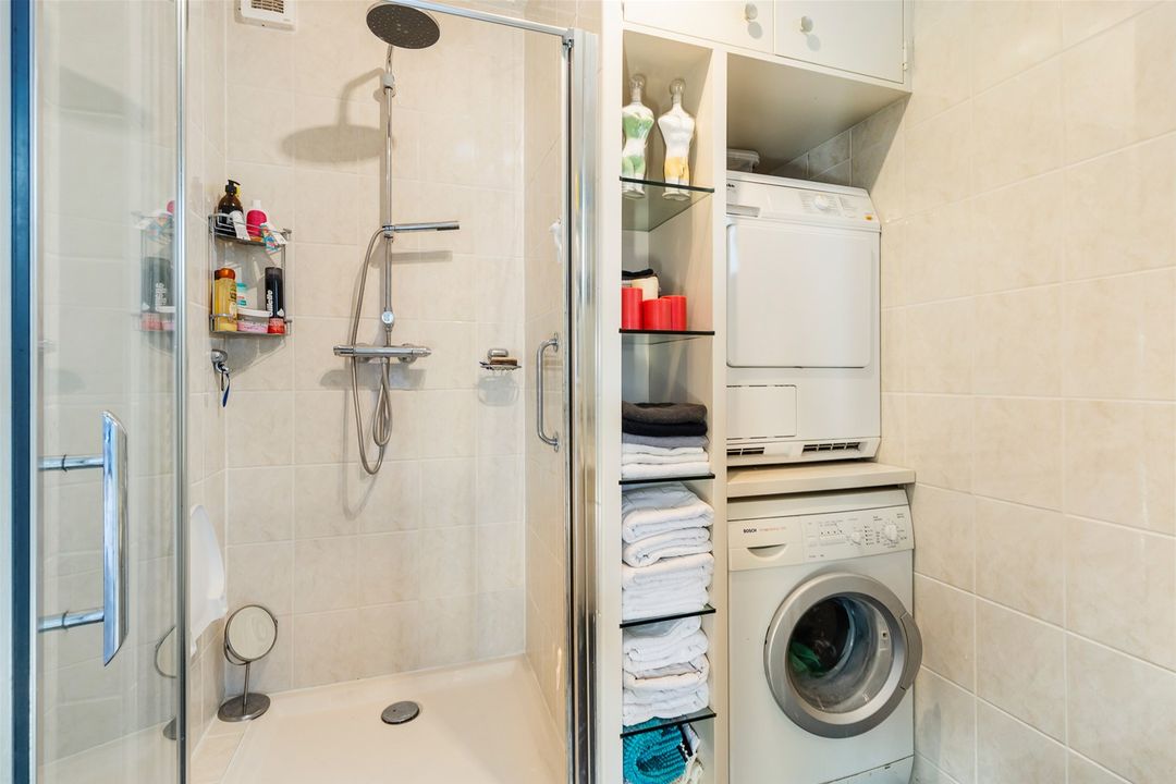 Ruime Slaapkamer. Nette badkamer met douche en wastafel en opstelling witgoed.