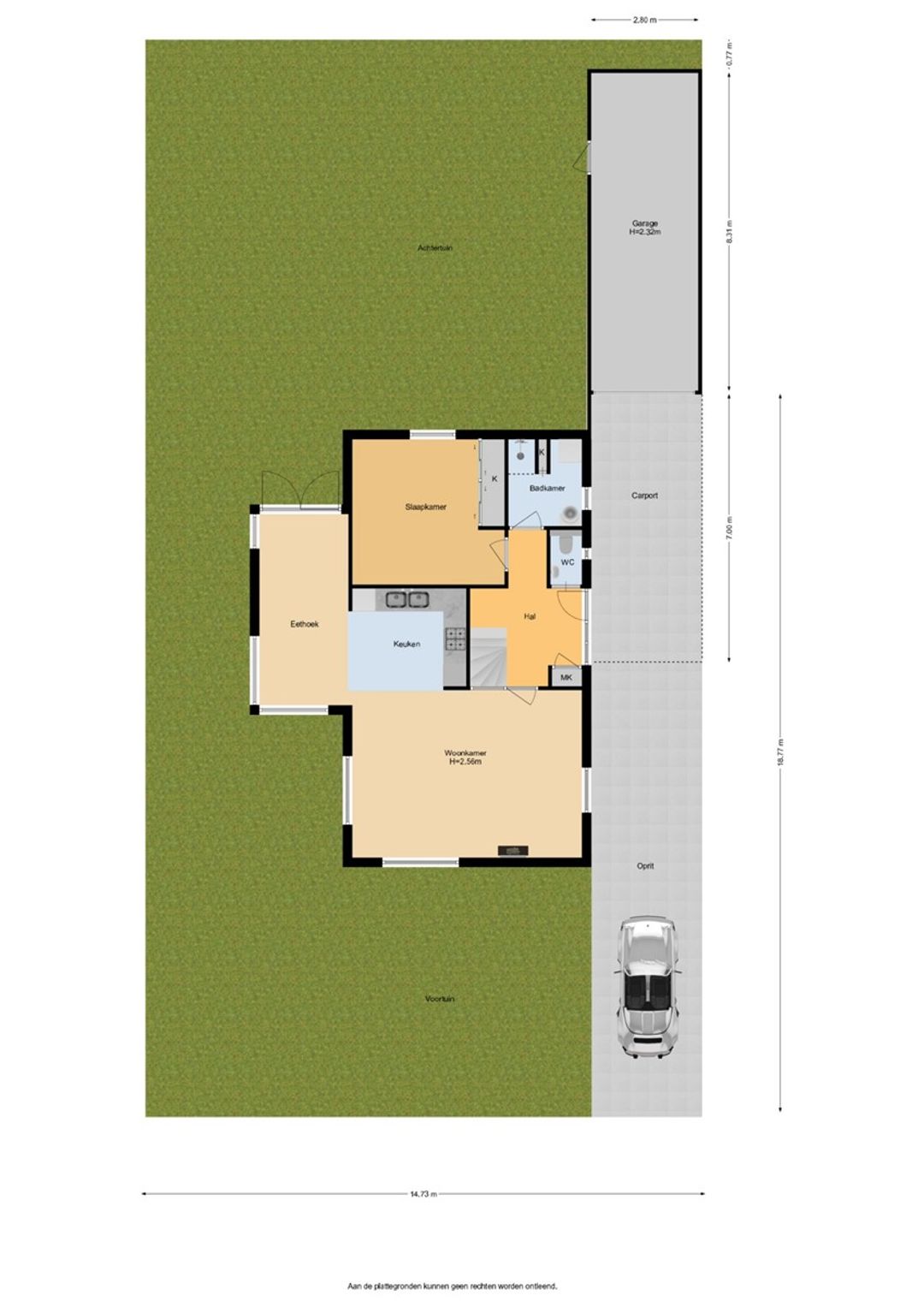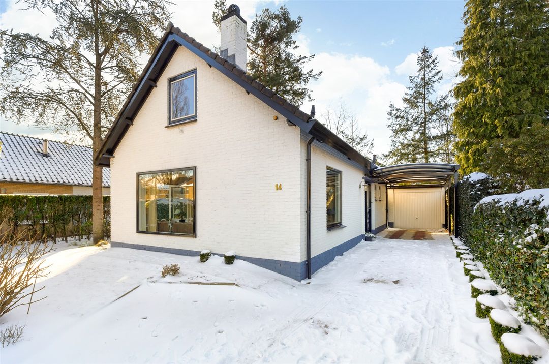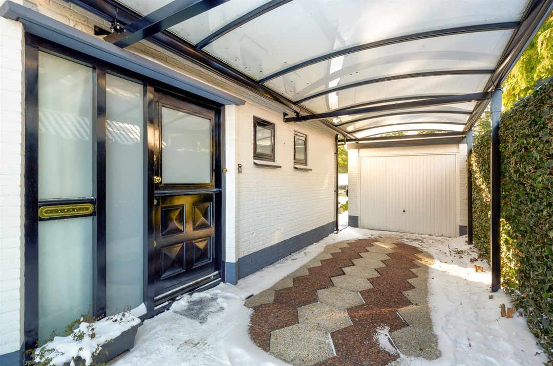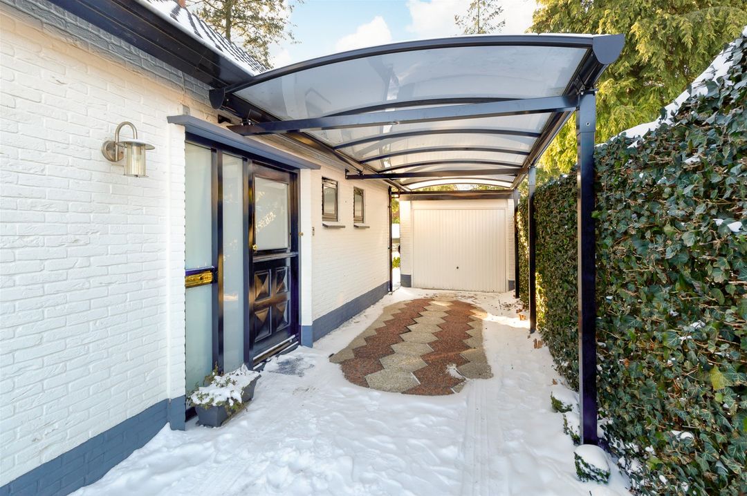 Oprit op eigen terrein voor meerdere auto’s en een carport van 7 meter, toegang tot de verlengde stenen garage.