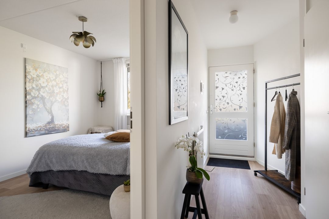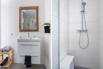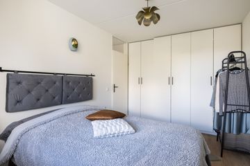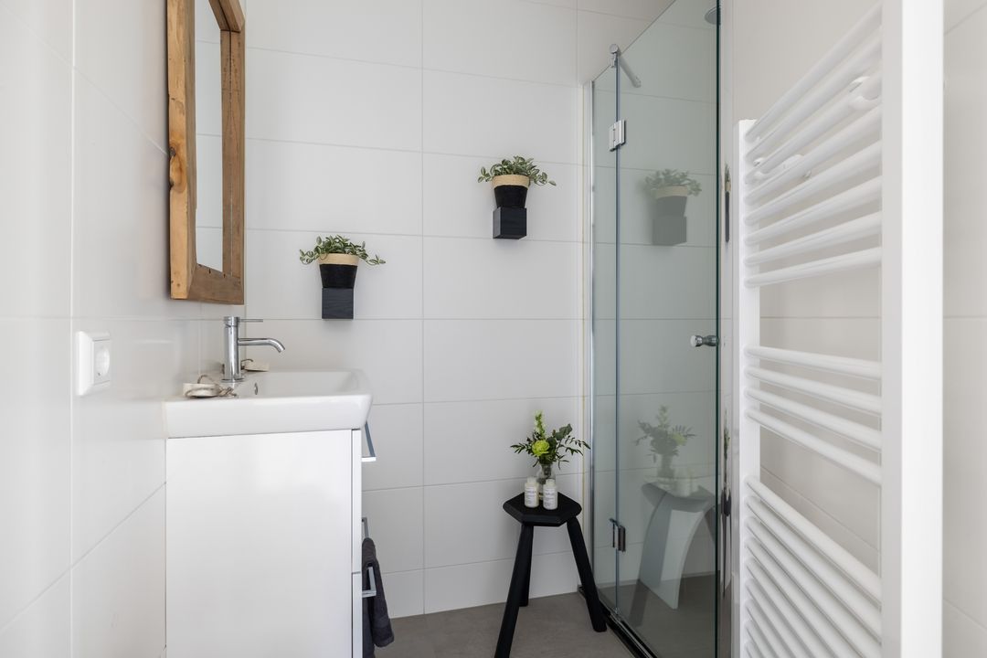 Vanuit de centrale hal loop je door de lange gang langs alle vertrekken. De fijne slaapkamer (aan de rustige achterzijde) is voorzien van horren en een elektrisch zonnescherm: lekker koel in de zomer en geen zoemende muggen s’ nachts – win-win! De badkamer is helemaal vernieuwd in 2022 en heeft een heerlijke regendouche, een moderne glazen deur, een strak wastafelmeubel en een comfortabele handdoekradiator. Ook het separate toilet is recent vernieuwd: fraai vrijhangend en randloos, mét handig fonteintje.