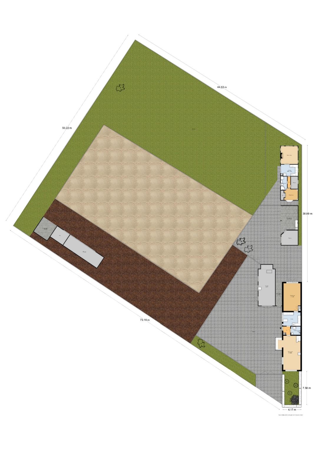 Het voerstation en de stal liggen op een verhard gedeelte dat grenst aan de gedraineerde paddock van 20 x 40 meter.